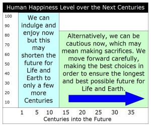 Consider the graph shown. On the vertical scale is the happiness level that we can experience as human beings over the next number of centuries. At the bottom of the horizontal scale are the numbers of centuries. The light blue area represents maximum indulgence, in which case we show no concern for the future. Possibly our irresponsible approach toward climate change, or our uncontrolled development of technologies such as viruses or nuclear weapons will allow us to possibly live another 10 centuries as shown on the bottom scale. On the other hand, if we exhibit caution and make "intelligent" choices, whereby we tend toward globalization and create a global education system that might help us prepare for the impact of our changing technologies, we may endure many centuries longer. In a sense, we may have to give up a bit of indulgence now for a longer and better future. In fact, it may be the case that if we interpret the world around us accurately, and we make favourable choices for the survival of Life and Earth, we may endure even longer than the 35 centuries shown on the graph. Of course, the numbers on the graph are entirely arbitrary, but the point made is that our objective as human beings is to live long and prosper.